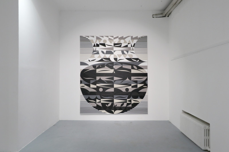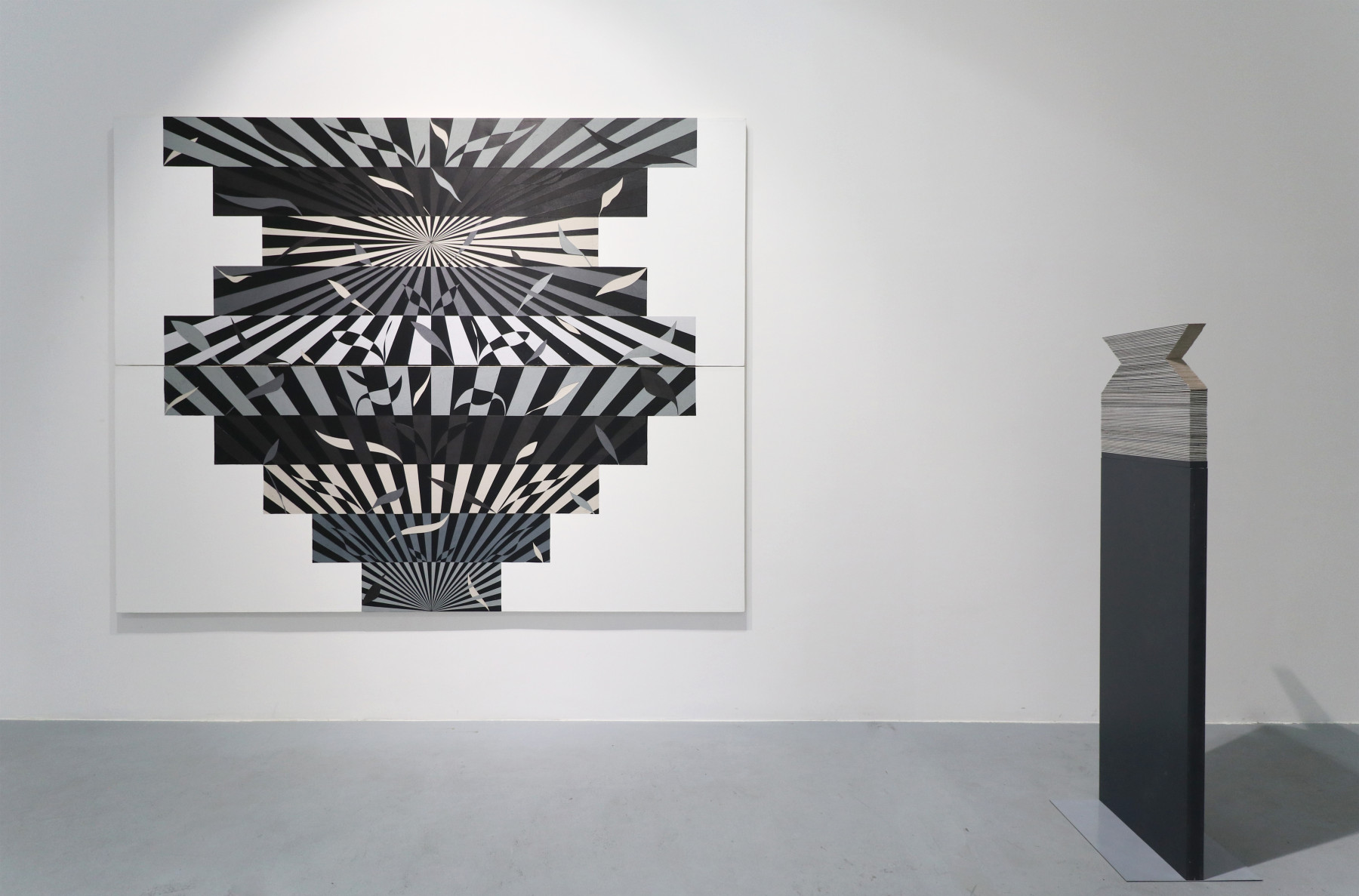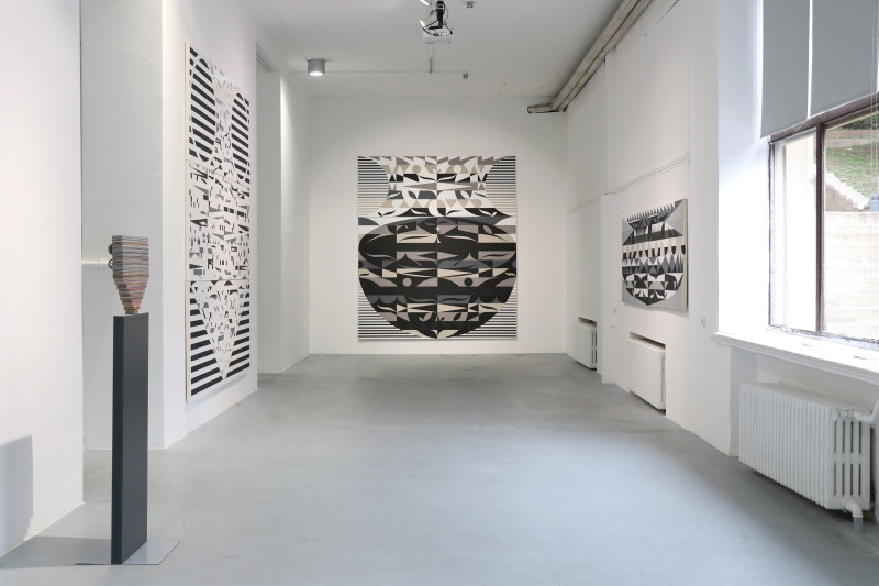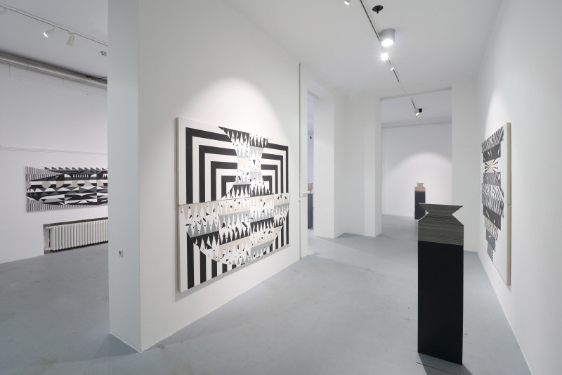 Yes, almost entirely, because this exhibition, Palindromes: Paintings and Objects, is a kind of intentional exception to the general rule. The selection of works at Lauba is made up of eleven monumental vertical collages, with the addition of nine much smaller objects (each accompanied by its own pedestal). They are united by two common traits – the motif of a vase, which acts as a faint formal feature more or less recognisable in all compositions (both the two-dimensional and the three-dimensional ones; the objects are basically two-sided planes whose minimal depth creates the unavoidable third dimension), and the productive process that shapes the compositions and that lends its name to the whole series. Palindrome is the “antique term for an expression, word, part of text, sentence, or verse that is the same whether read forward or backward” (according to the online edition of the Croatian Encyclopaedia) and is today most frequently used in puzzle solving. The word “palindrome” should not be understood as a literal descriptor of the author’s compositions: they are obviously not the same when observed from up to down or from left to right (or the other way around). One should instead focus on the processes of reversal, variation, transposition, or displacement of chosen formal elements, which are sometimes completely abstract and geometric, and sometimes look like floral motifs found in nature or, less often, like motifs found in man-made environments built by human hands and machines. The wholes are nevertheless fully abstract, and the collages are all arranged as triptychs with pieces that are logically added to one another like puzzles. However, these pieces could function in other combinations too, which goes to show that the artist has envisioned essentially endless possibilities of variation, both within individual collages and within the entire series. But what is particularly fascinating to the keen observer, apart from the result of the process, is the process itself, which is (intentionally or unintentionally?) well hidden rather than self-evident. For it to be appreciated, one should engage in conversation with the author and make a conscious effort to understand his principles and intentions. The key to Sobota’s collages is that he does not preplan them, except in the broadest of senses (like choosing the triptych form), he does not make sketches, and he does not test his compositions before “attacking the surface.” His process – although chiefly geometrical — is also highly intuitive, much in the vein of abstract expressionists, although his end goals are very different, even opposite to theirs. It behooves us to think about the level of creative confidence and self-control that is needed to make such refined compositions directly — not by cutting and pasting pieces of paper one on top of another, but by the inverse action of gradually cutting pieces out of several layers of paper pasted on the base surface of the collage. Intuition does seem to be the key idea (and tool) in thinking about Sobota’s work, and it might be appropriate to regard his artistic process as “intuitive geometry” that approaches abstract art from a profoundly different position than that of the artists mentioned at the beginning of this text. Sobota’s work can therefore be interpreted as a very personal synthesis of different traditions within abstract art – from the highly modern to the postmodern; from constructivism, op-art and abstract expressionism to analytical painting and to other “even newer” tendencies that appeared after the long period of international modernism had ended.